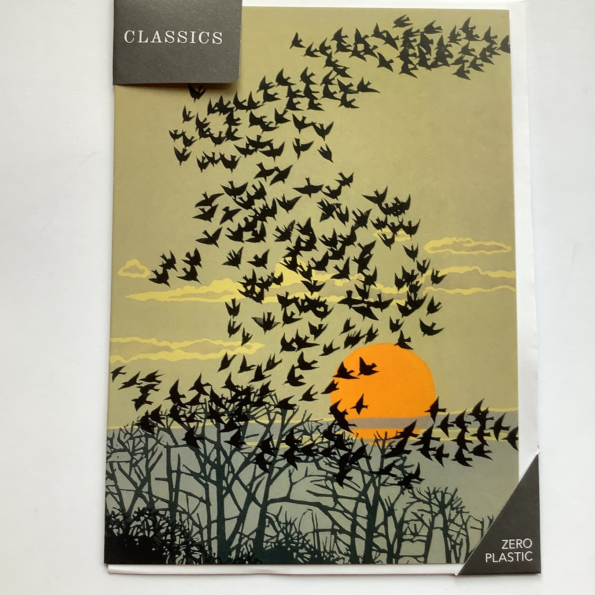 Starlings preforming aerial Manoeuvres above their roost in the evening light Linocut by Robert Gillmor