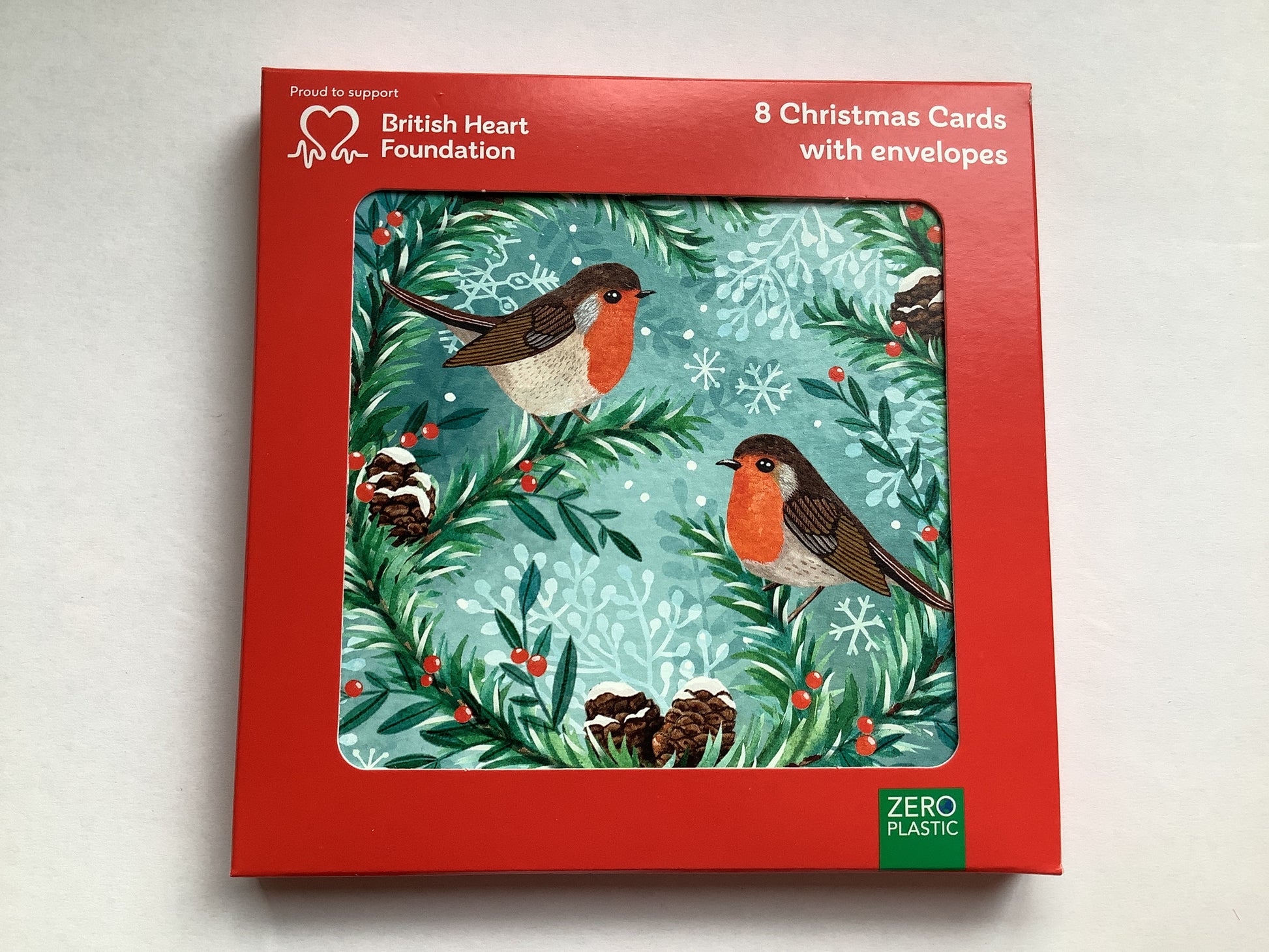 Eight Charity Christmas cards depicting two red robins, the greeting inside card reads Merry Christmas and a Happy New Year. Zero plastic packaging and 10% to British Heart Foundation.