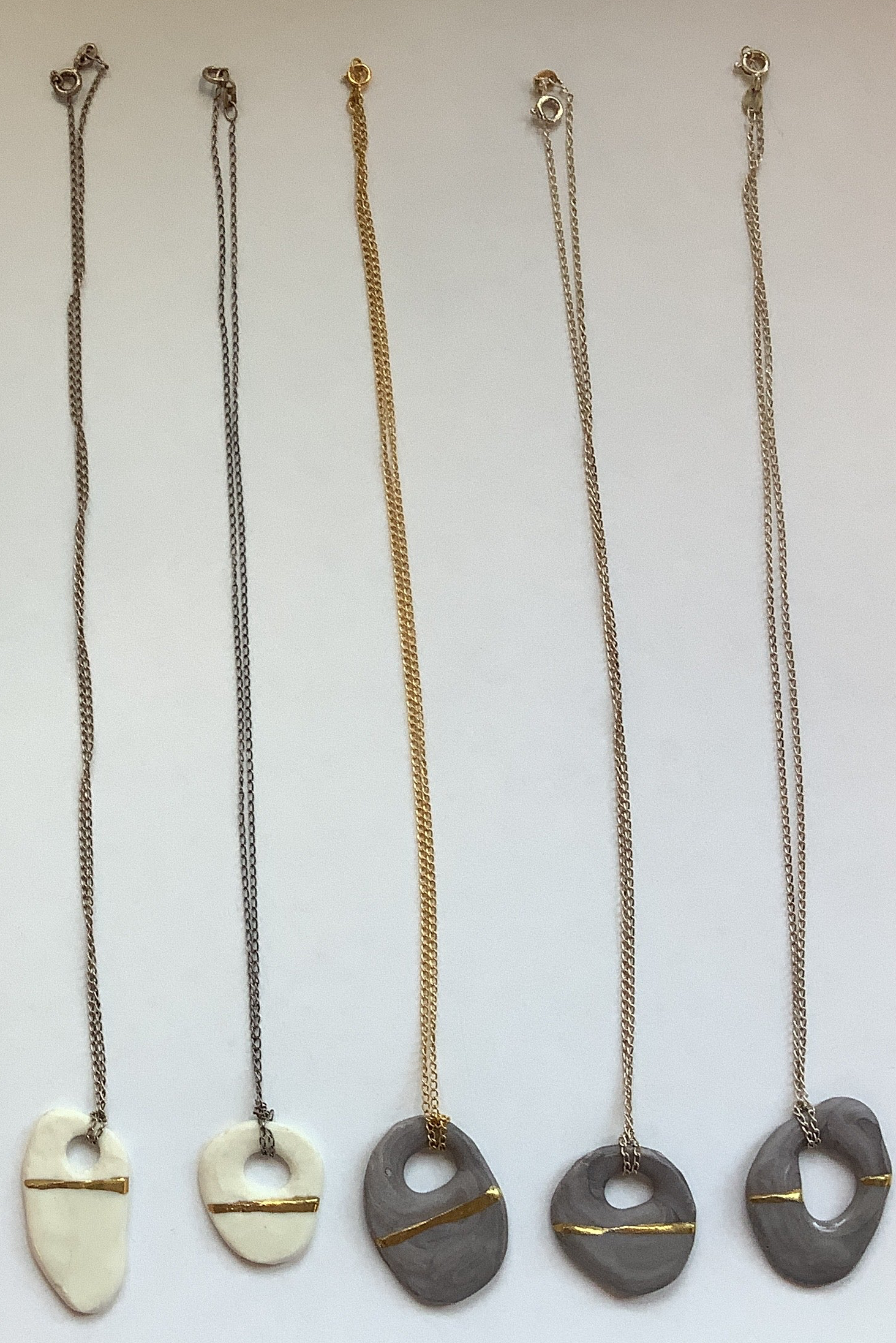 Assorted porcelain pendants with gold lustre decoration with chains (Approximately 20cms long)