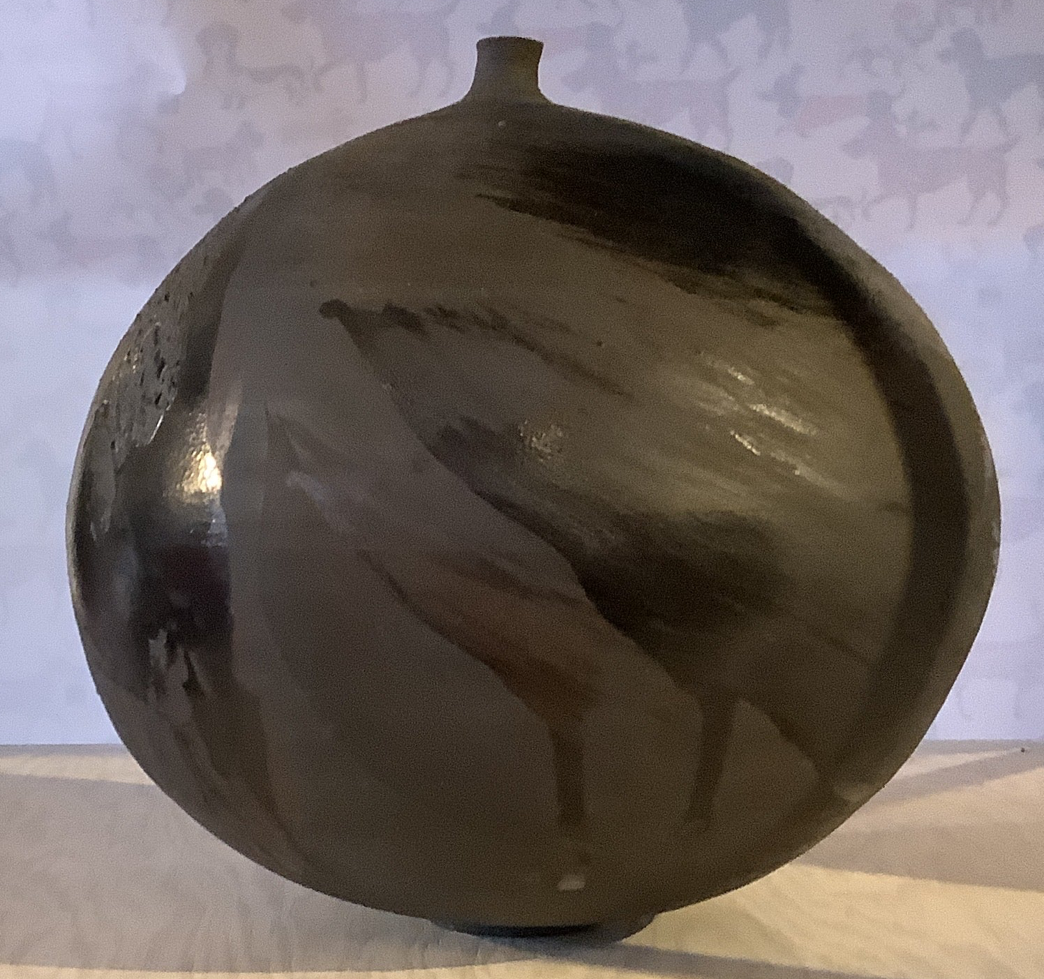 Small organic sculptural form, with subtle lively brown brush marks over the pots entire surface. (approximately 20cms in height)