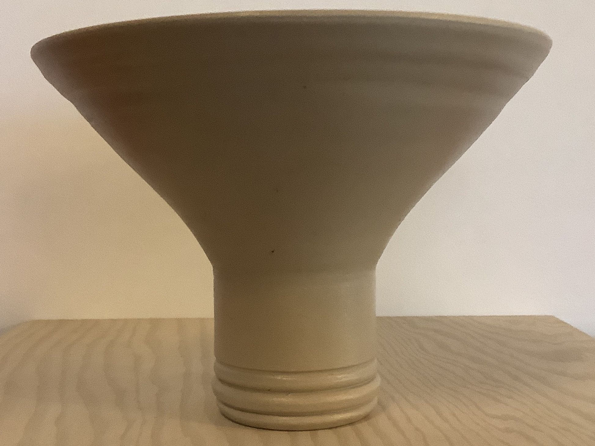 Beautifully hand thrown pot with elongated ribbed base, light blue glaze on the inside of the bowl created Peter White